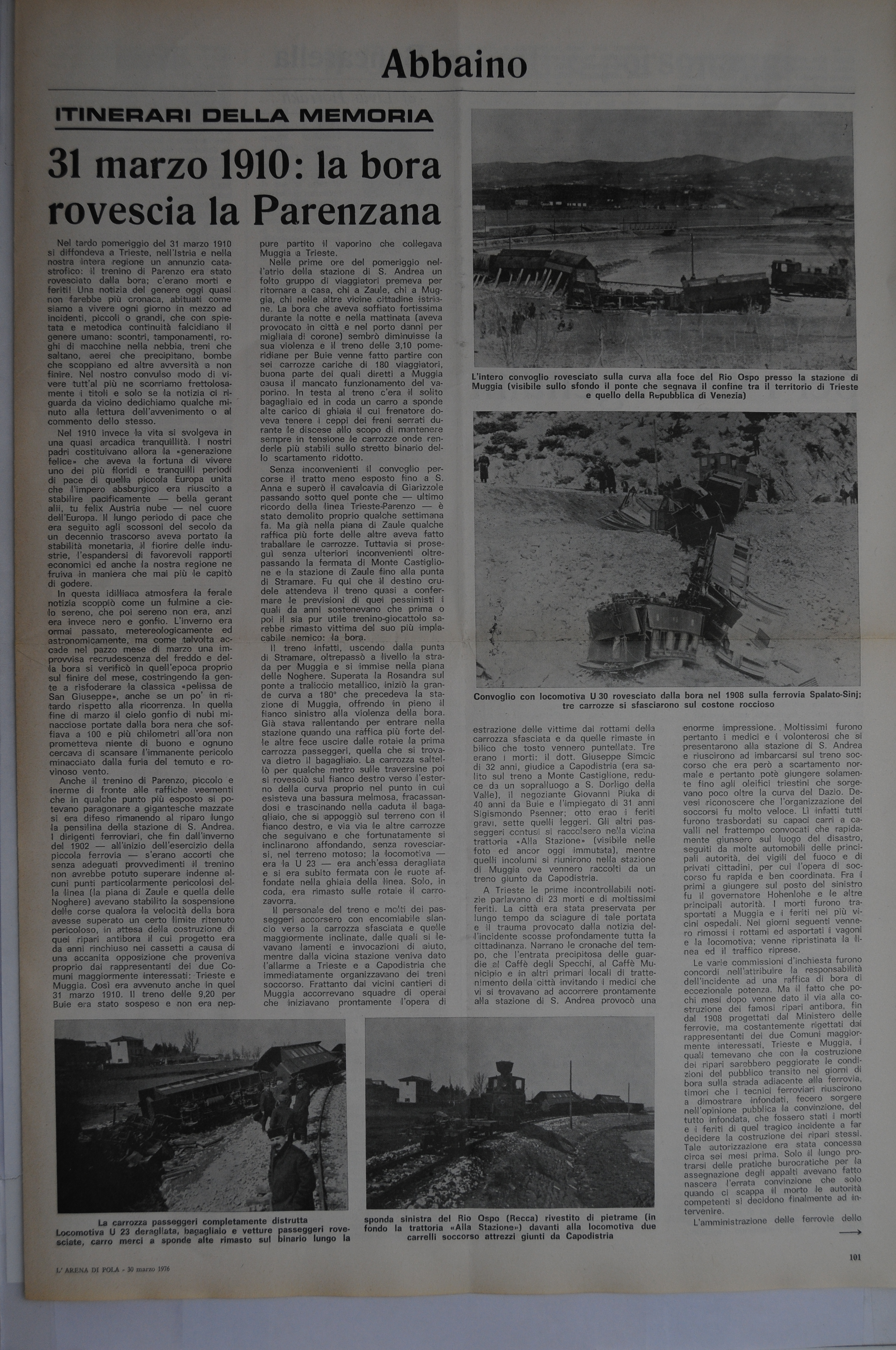 Nel tardo pomeriggio del 31 marzo 1910 si diffondeva a Trieste, nell'Istria e nella nostra 'intera regione un annunzio catastrofico: il trenino di Parenzo era stato rovesciato dalla bora; c'erano morti e feriti! Una notizia del genere oggi quasi non farebbe più cronaca, abituati come siamo a vivere ogni giorno ìn mezzo ad incidenti, piccoli o grandi, che con spietata e metodica continuità falcidiano il genere umano: scontri, tamponamenti, roghi di macchine nella nebbia, treni che saltano, aerei che precipitano, bombe che scoppiano ed altre avversità a non finire. Nel nostro convulso modo di vivere tutt'al più ne scorriamo frettolosamente i titoli e solo se la notizia ai riguarda da vicino dedichiamo qualche minuto alla lettura dell'avvenimento o al commento dello stesso.