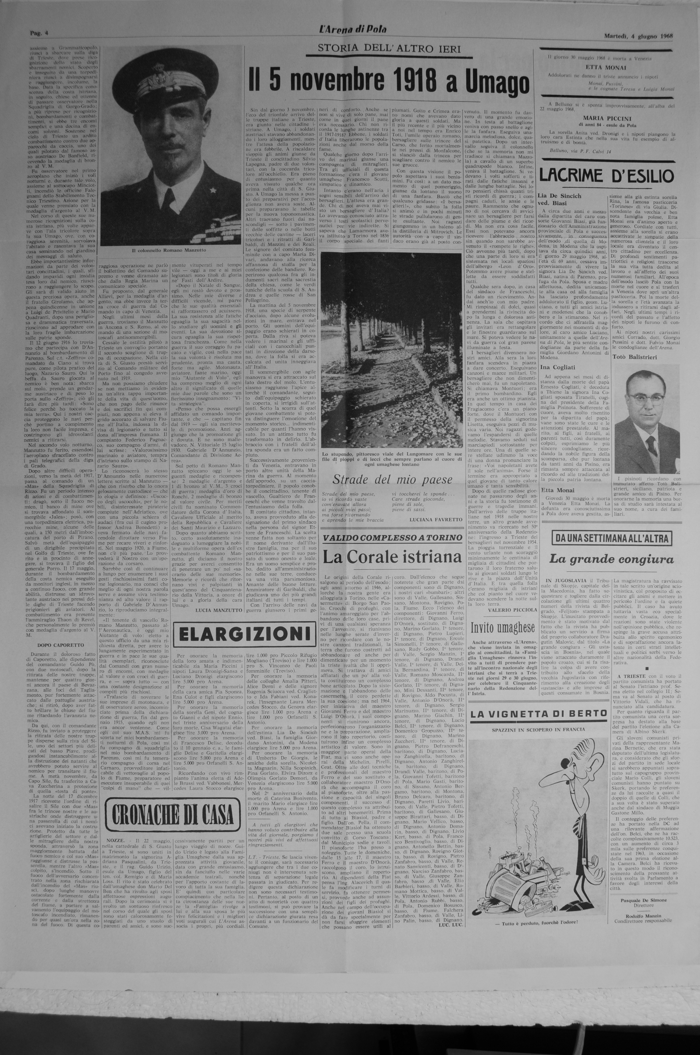 Sul petto di Romano Manzutto spiccano oggi le seguenti medaglie e ricompense: 2 medaglie d'argento e I di bronzo al V. M.. 3 croci di guerra; medaglia d'oro di Rauchi, 2 medaglie di bronzo al valore civile. Per meriti civili fu nominato Commendatore della Corona d'Italia, Cavaliere Ufficiale al merito della Repubblica e Cavaliere dei Santi Maurizio e I avaro. Dopo quanto abbiamo scritto, certo assolutamente inadeguato a lumeggiare la nobile e multiforme opera dell'ex combattente Romano Manzutto, gli diciamo il nostro grazie per averci consentito di penetrare un po' nel «sacrario delle sue memorie,. Memorie e ricordi che ritornano vivi e palpitanti in quest'anno del Cinquantenario della Vittoria, a onore di lui e a gloria della cara Umago.