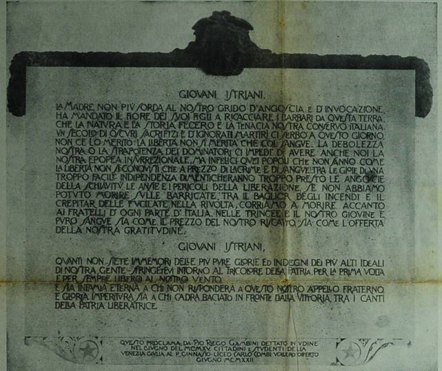 Testo del proclama di Pio Riego Gambini, firmato anche da Piero Almerigogna, Luigi Ruzzier e Luigi Bilucaglia, nel 1915 allo scoppio della guerra.Il marmo che lo riproduceva, posto nell'ingresso del Liceo, è stato fracassato dai »civili» occupatori attuali