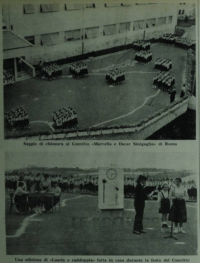 Roma, giugno Si è svolta il giorno 3 giugno u. s. alla Borgata dei Giuliani di Roma, nel piazzale .1 Collegio Femminile, l'annuale saggio di chiusura delle allieve degli Istituti .Marcella ed Oscar Sinigaglia.. Vi hanno assistito Donna Carla Gronchi, la Signora Marcella Sinigaglia Presidente del Madrinato l'alico con numerose madrine, rappresentanti del Ministero dell'Interno,...
