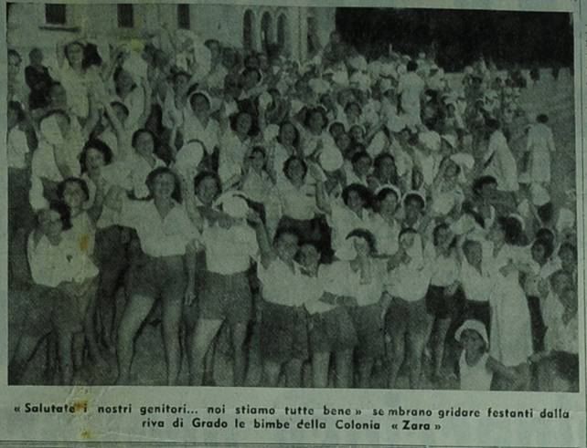 Salutate i nostri genitori... noi stiamo tutte bene sembrano gridare festanti dalla riva di Grado le bimbe della Colonia a Zara