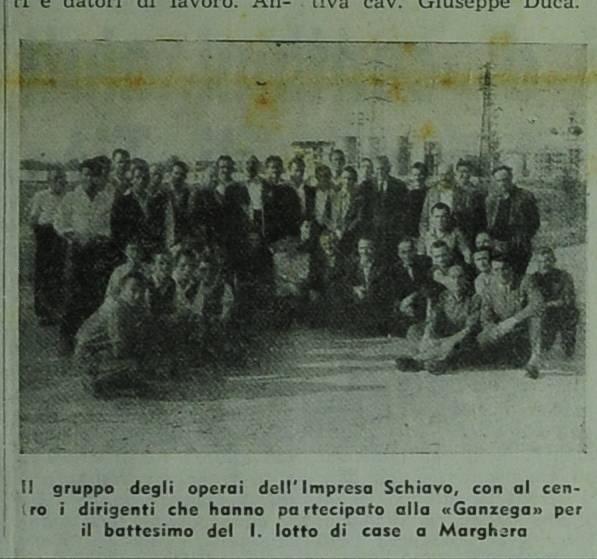 Il gruppo degli operai dell'Impresa Schiavo, con al cent¬ro i dirigenti che hanno partecipato alla Ganzega per il battesimo del I. lotto di case a Marghera