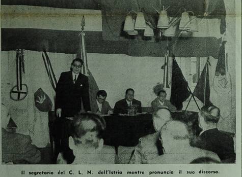 foto, didascalia: Il segretario del C. L. N, dell'Istria mentre pronuncia il suo discorso.