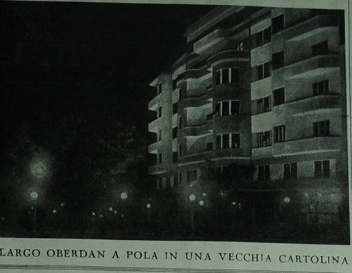 foto, didascalia Visioni notturne d'un mondo perduto LARGO OBERDAN A POLA IN UNA VECCHIA CARTOLINA 28/07/1954 |