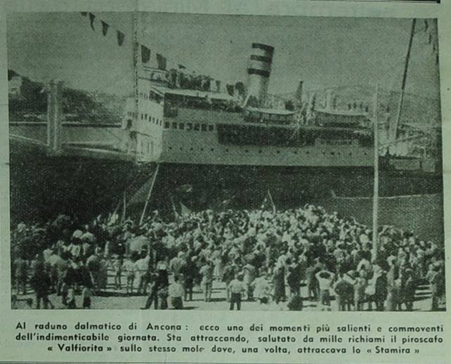 foto, didascalia: Al raduno dalmatico di Ancona ecco uno dei momenti più salienti e commoventi dell'indimenticabile giornata. Sta attraccando, salutato do mille richiami il piroscafo Volfiorito sullo stesso molo dove, una volta, attraccava lo «Stamira»