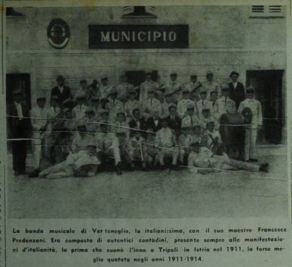 foto, didascalia: La banda musicale di Verteneglio, la italianissima, con il suo maestro... 01/12/1954