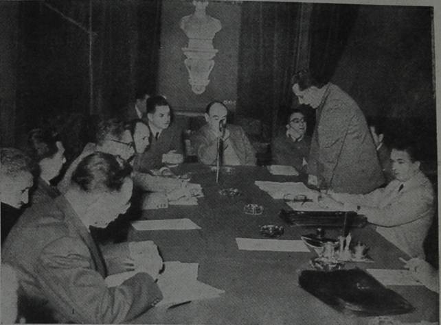 Didascalia: La riunione degli esperti a Trieste per la discussione del problema del risarcimento dei beni abbandonati: sta pelando l'avv. Ponis. Da sinistra. geom. Albanese., ing. Cassini, doti. Balanza, Rovatti, Manzin, on. Ceccherini, on. Schiratti, dott. Fragiocorno, avv. Ponis, avv. Andreicich