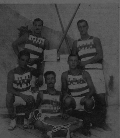 L'equipaggio vincitore nella jole a 4 juniores alla regata internazionale di Barcola 1909 : Stenta Umbero, Cattalini Simeone, Miller Luigi, Toniatti Carlo e il tim. Girolamo Bogdanovich