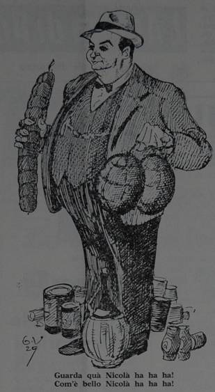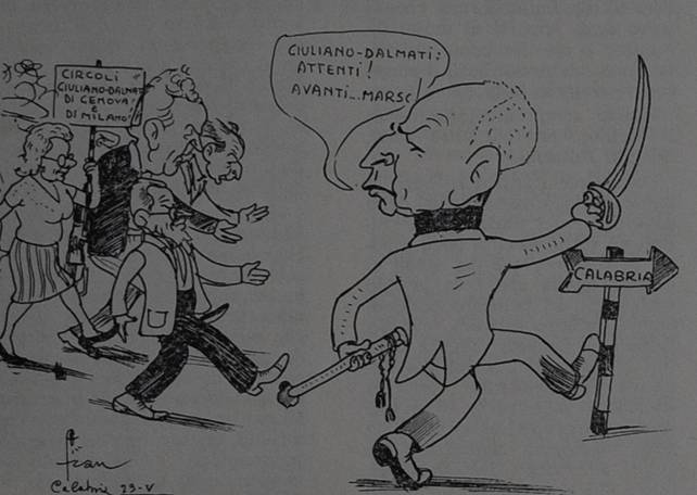 El conducator con la sciabola sguainata è il generale Nino La Camera, segretario calabrese del Circolo di Genova; gli altri sono la truppa, e precisamente: Mario Franci, il nanerottolo caricaturista, il lunghissimo Illyricus, Giorgio Pussini, segretario del Circolo di Milano. Argia Ferlan, sua legittima consorte, regge il cartello; gli altri non si vedono ma ci sono. [Vedi le note di cronaca calabresi nei numeri 2153-4-5-6].