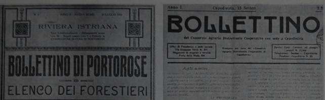 Esce nel maggio del 1920, riporta anche l'elenco dei forestieri di Brioni, tipografia C. Priora, Capodistria; una copia lire una