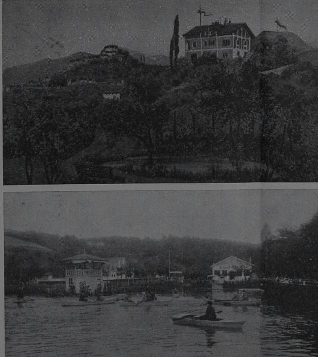 Didascalia: Due vedute dell'Hilmteich in Val di Rose; sul laghetto d'inverno poteva essere praticato il pattinaggio su ghiaccio; si intravede il «Sane Soucl», luogo di ristoro e sala da ballo (collezione Zottar)