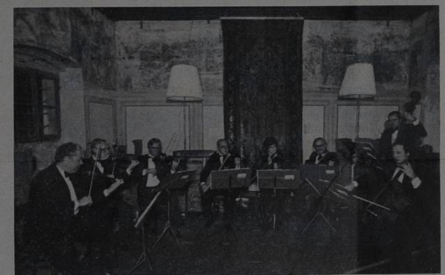 Didascalia:Il Complesso da camera goriziano durante il concerto nella sala degli affreschi a palazzo Atteme (vedi «Arena» n. 2169)