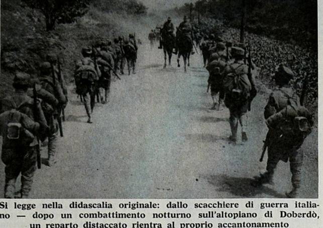 Si legge nella didascatia originale: dallo scacchiere di guerra italiano — dopo un combattimento notturno sull'altopiano di Doberdò, un reparto distaccato rientra al proprio accantonamento