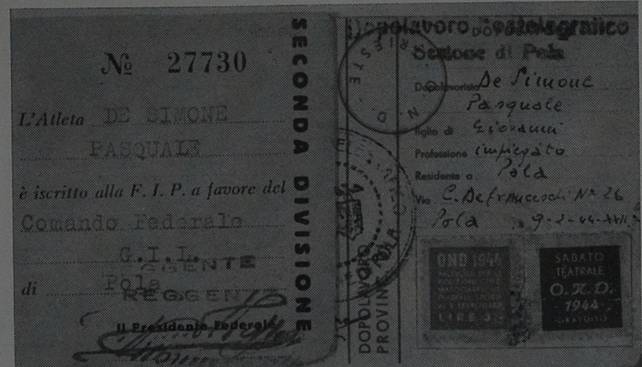 La tessera d'affiliazione alla Federazione pallacanestro allorché nel 1942 giocavo con la squadra della Gil (gioventù italiana del littorio) disputando tornei locali e partite a Trieste, Pirano, Parenzo e Pisino, e la tessera d'affiliazione al Dopolavoro dei postelegrafonici durante l'impiego alla Posta di Pola tra la fine del 1943 e la primavera del 1944
