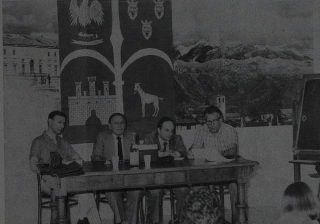 Didascalia: Merlino, Donati, Damiani e Cattalini alla presentazione del volume «Un tempo, un amore» del fiumano Donati a Udine (foto Franco studio)