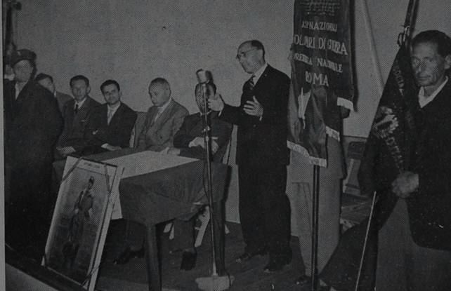Didascalia:Ettore Cozzani commemora nel 1957 Vittorio Locchi a Figline Valdarno, luogo natale dell'autore della Sagra di Santa Gorizia, alla presenza del gen. Baruzzi che per primo entrò a Gorizia 1'8 agosto 1916; morto Cozzani sono finite anche le riedizioni della Sagra, un esempio di poesia civile osteggiato dalla critica e relegato nel dimenticatoio