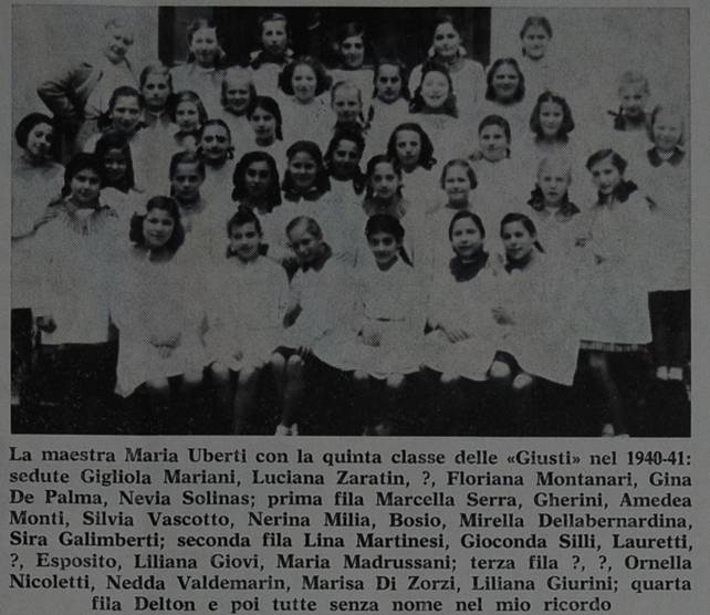 Didascalia: La maestra Maria Uberti con la quinta classe delle «Giusti» nel 1940-41: sedute Gigliola Mariani, Luciana Zaratin, ?, Floriana Montanari, Gina De Palma, Nevia Solinas; prima fila Marcella Serra, Gherini, Amedea Monti, Silvia Vascotto, Nerina Milia, Bosio, Mirella Dellabernardina, Sira Galimberti; seconda fila Lina Martinesi, Gioconda Siili, Lauretti, ?, Esposito, Liliana Giovi, Maria Madrussani; terza fila ?, ?, Ornella Nicoletti, Nedda Valdemarin, Marisa Di Zorzi, Liliana Giurini; quarta fila Delton e poi tutte senza nome...