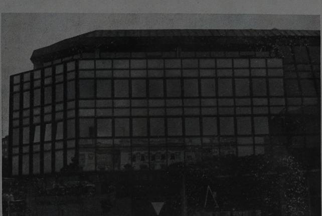 II nostro vecchio Liceo Carducci a Pola illuminato dai bagliori del tramonto si specchia nelle vetrate d'un moderno edificio di via Promontore. Orfeo Sprizzai La foto a colori è meravigliosa; nella riproduzione in bianco e nero molta parte della suggestione andrà perduta.