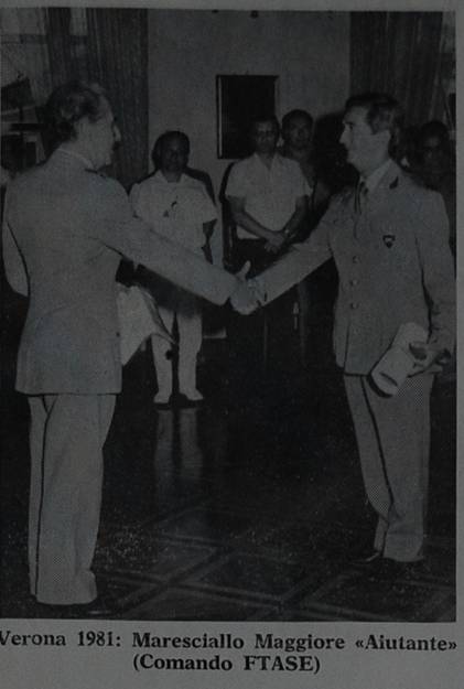 Momento storico de importansa internassionale e potensa della democrassia: el Maresciallo Caddi cav. Lodovico ghe concedi al General de Division — Capo di Stato Maggiore del Comando FTASE — Giovanni De Bartolomeie el permesso de strenserghe la man in ocasion del Sito (del Maresciallo) congedo militare. Dopo 42 anni, 3 mesi, 19 giorni di servizio, dei quali 21 presso il Comando FTASE di Verona, il Nostro è transitato nella Riserva e potrà dedicare, finalmente tutto il Suo tempo libero al Liston e agli amici. Cossa farà l'Alleansa Atlantica...