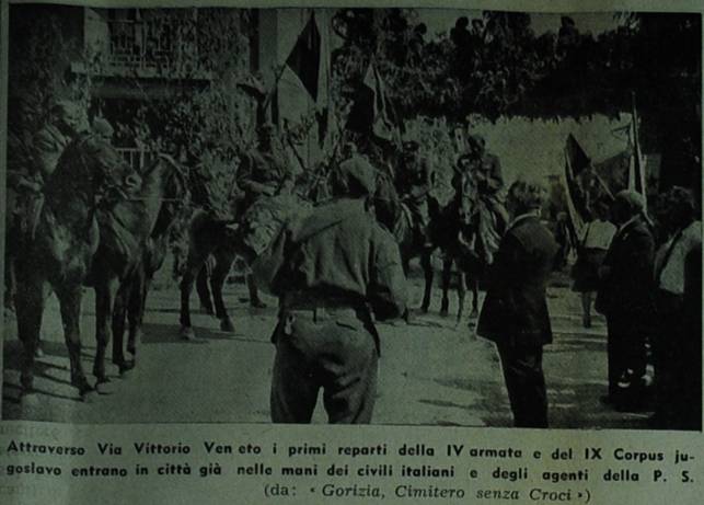 Didascalia: Attraverso Via Vittorio Veneto i primi reparti della IV armata e del IX Corpus jugoslavo entrano in ci. già nelle mani dei civili italiani e dagli agenti della P. S. (da: Gorizia, Cimitero senza Croci )