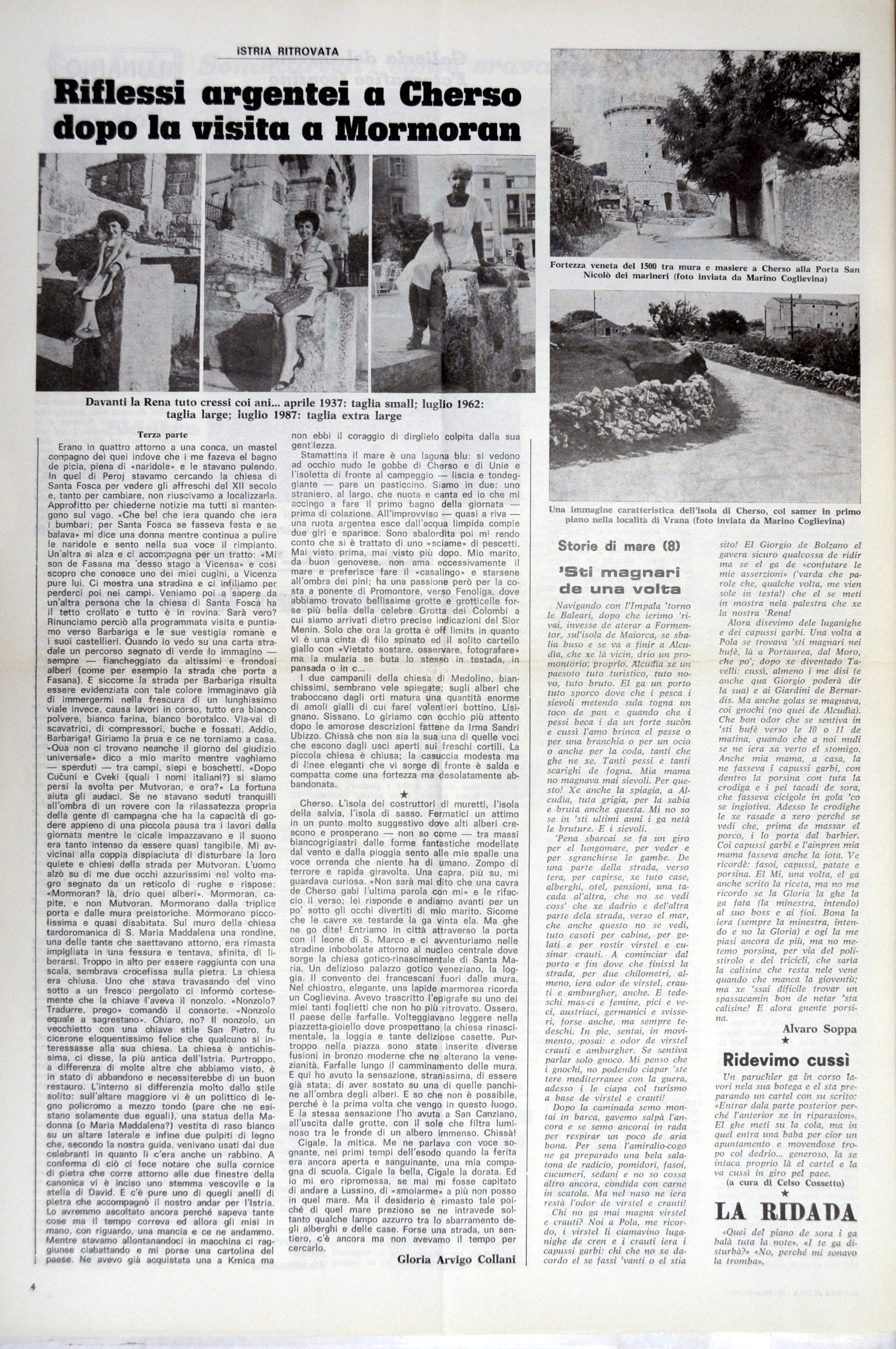 Cherso. L'isola dei costruttori di muretti, l'isola della salvia, l'isola di sasso. Fermatici un attimo in un punto molto suggestivo dove alti alberi crescono e prosperano — non so come — tra massi biancogrigiastri dalle forme fantastiche modellate dal vento e dalla pioggia sento alle mie spalle una voce orrenda che niente ha di umano. Zompo di terrore e rapida giravolta. Una capra, più su, mi guardava curiosa. Non sarà mai dito che una cavia de Cherso gabi l'ultima parola con mi. e le rifaccio il verso; lei risponde e andiamo avanti per un po' sotto gli occhi divertiti di mio marito, Sicome che le cavie ne testarde la ga vinta ela. Ma ghe ne go dite! Entriamo in città attraverso la porta con il leone di S. Marco e ci avventuriamo nelle stradine inbobolate attorno al nucleo centrale dove sorge la chiesa gotico-rinascimentale di Santa Maria. Un delizioso palazzo gotico veneziano, la loggia. Il convento dei francescani fuori dalle mura. Nel chiostro, elegante, una lapide marmorea ricorda un Coglievina. Avevo trascritto l'epigrafe su uno dei miei tanti foglietti che non ho più ritrovato. Ossero. Il paese delle farfalle. Volteggiavano leggere nella piazzetta-gioiello dove prospettano la chiesa rinascimentale, la loggia e tante deliziose casette. Purtroppo nella piazza sono state inserite diverse fusioni in bronzo moderne che ne alterano la venezianità. Farfalle lungo il camminamento delle mura. E qui ho avuto la sensazione, stranissima, di essere già stata; di aver sostato su una di quelle panchine all'ombra degli alberi. E so che non è possibile, perché è la prima volta che vengo in questo luogo. E la stessa sensazione l'ho avuta a San Canziano, all'uscita dalle grotte, con il sole che filtra luminoso tra le fronde di un albero Immenso. Chissà! Cigale. la mitica. Me ne parlava con voce sognante, nei primi tempi dell'esodo quando la ferita era ancora aperta e sanguinante, una mia compagna di scuola. Cigale la bella, Cigale la dorata. Ed io mi ero ripromessa, se mai mi fosse capitato di andare a Lussino, di smoiarme a più non posso in quel mare. Ma il desiderio è rimasto tale poiché di quel mare prezioso se ne intravede soltanto qualche lampo azzurro tra lo sbarramento degli alberghi e delle case. Forse una strada, un sentiero, c'è ancora ma non avevamo il tempo per cercarlo.