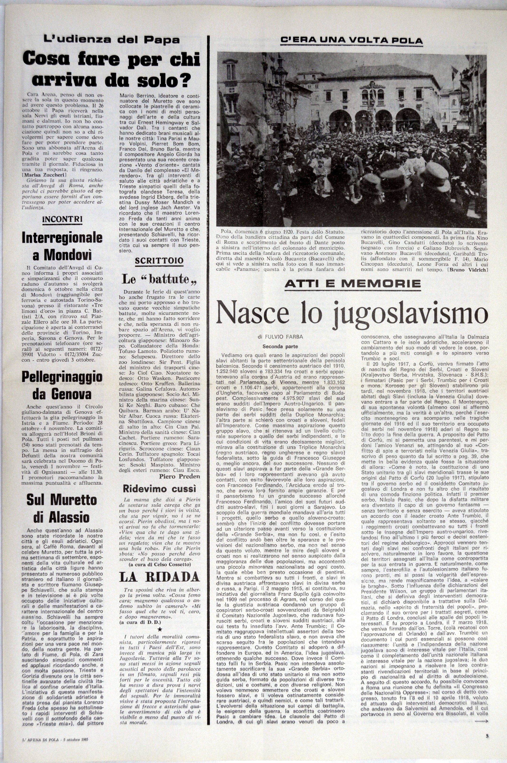Pola, domenica 6 giugno 1920. Festa dello Statuto. Dono della bandiera cittadina da parte del Comune di Roma e scoprimento del busto di Dante posto a sinistra nell'interno del colonnato del municipio. Prima uscita della fanfara del ricreatorio comunale, diretta dal maestro Nicolò Bucavetz (Bucavelli) che qui si vede a sinistra nella foto con gl suo immancabile «Panama»; questa è la prima Fanfara del ricreatorio dopo d'annessione di Pola all'Italia. Eravamo in quattordici componenti. ln prima fila Nino Bucavelli, Gino Condotti (deceduto) lo scrivente (segnato con freccia) e Galiano Dobrovich. Seguivano Anteriore Bucavelli (deceduto), Garibaldi Trolie (affondato con il sommergibile F. 14), Mario Cincopan (deceduto), Leone Forza ed altri i cui nomi sono smarriti nel tempo.