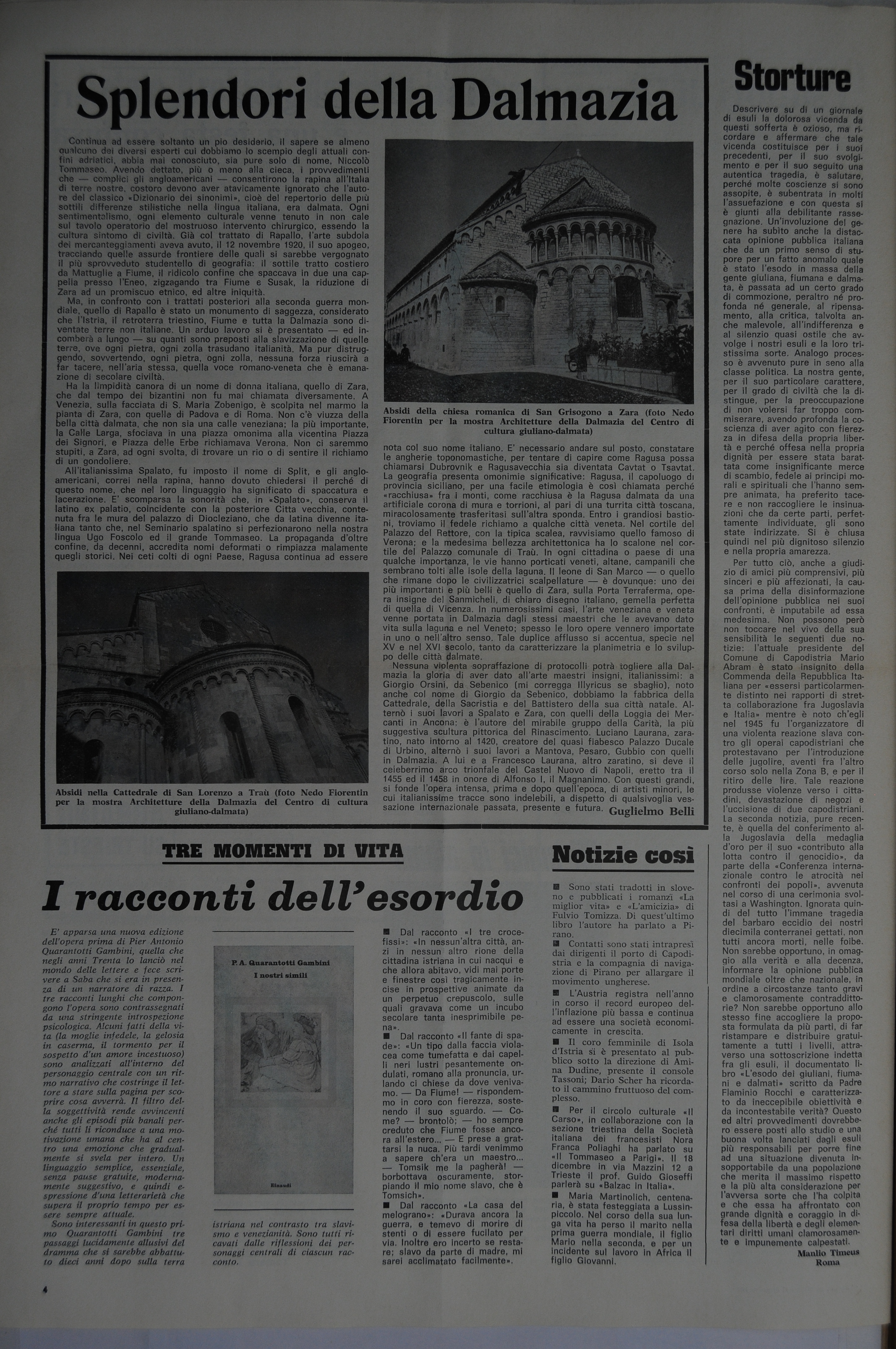 Nessuna violenta sopraffazione di protocolli potrà togliere alla Dalmazia la gloria di aver dato all'arte maestri insigni, italianissimi: a Giorgio Orsini, da Sebenico (mi corregga Illyricue se sbaglio), noto anche col nome di Giorgio da Sebenico, dobbiamo la fabbrica della Cattedrale, della Sacristia e del Battistero della sua città natale. Alternò i suoi lavori a Spalato e Zara, con quelli della Loggia dei Mercanti in Ancona: è l'autore del mirabile gruppo della Carità, la più suggestiva scultura pittorica del Rinascimento. Luciano Laurana, zara-tino, nato intorno al 1420, creatore del quasi fiabesco Palazzo Ducale di Urbino, alternò i suoi lavori a Mantova, Pesaro, Gubbio con quelli in Dalmazia. A lui e a Francesco Laurana, altro zaratino, si deve il celeberrimo arco trionfale del Caste! Nuovo di Napoli, eretto tra il 1455 ed il 1458 in onore di Alfonso I, il Magnanimo. Con questi grandi, si fonde l'opera intensa, prima e dopo quell'epoca, di artisti minori, le cui italianissime tracce sono indelebili, a dispetto di qualsivoglia vessazione internazionale passata, presente e futura.