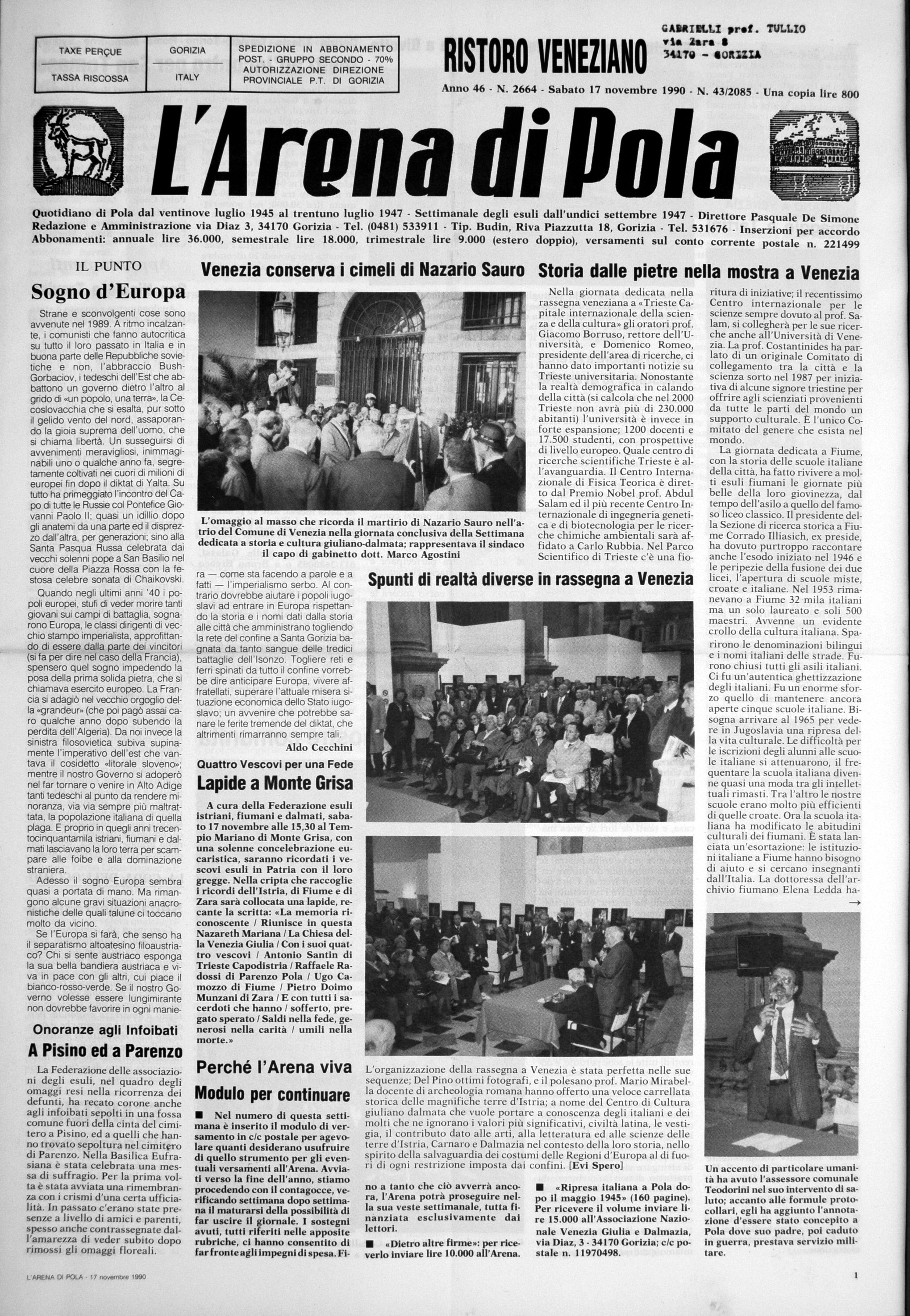 L'organizzazione della rassegna a Venezia è stata perfetta nelle sue sequenze; Del Pino ottimi fotografi, e il polesano prof. Mario Mirabella docente di archeologia romana hanno offerto una veloce carrellata storica delle magnifiche terre d'Istria; a nome del Centro di Cultura giuliano dalmata che vuole portare a conoscenza degli italiani e dei molti che ne ignorano i valori piia significativi, civiltà latina, le vestigia, il contributo dato alle arti, alla letteratura ed alle scienze delle terre d'Istria, Carnaro e Dalmazia net contesto della loro storia, nello spirito della salvaguardia dei costumi delle Regioni d'Europa at di fuori di ogni restrizione imposts dai confini. [Evi Spero]