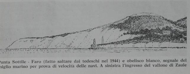 Punta Sottile Faro (fatto saltare dai tedeschi nel 1944) e obelisco bianco, segnale del miglio marino per prova di velocità delle navi. A sinistra l'ingresso del vallone di Zaule