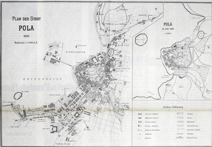 «Pola — Seine Vergangheit C.egenwart un Zukunft — Druk und Verlag von Karl Gerold's Sohn — Wien 1887». Questi i dati esplicativi della cartina che ci è stata gentilmente fornita da Marcello Bogneri e che consente di valutare l'enorme sviluppo urbanistico realizzatosi a Pola nell'arco di cinquant'anni; si tratta di un documento di lavoro che visualizza