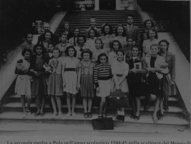 La seconda media a Pola nell'anno scolastico 1944-45 sulla scalinata del Museo di viale Carrara; nella prima fila in basso da sinistra Maria (Cicci) Caluzzi, Laura Pedrotti, Romana Iurlina un po' indietro, Gianna Cassani, Odette Bruno, Anna Maria Vettro, Giulia Arghittu, Licia Stocco, Iolanda Godeas, Maria Elena Demori, Cornelia Martinelli; in se- conda fila Adelia De Pardo, Liliana Ballarin, Myriam Andreatini, Anna Maria Sansa, Ni- dia Salamon, Nadia Imperatrice, Ivonne Bonivento, Armanda Dorigo; nella fila in alto il preside Fiorella,...