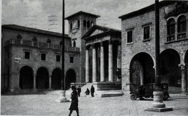 al Foro palazzina comunale completamente distrutta da un bombardamento, Tempio d'Augusto anch'esso colpito ma ricostruito e antico palazzo municipale