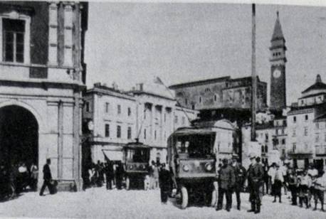 area di collegamento tra il rione di Punta e guano di Marciana, la piazza Tartini - grande musicista di cui s'intravede sullo sfondo la statua - sorse dall'interramento del preesistente mandracchio; in primo piano due vetture elettriche per il trasporto pubblico poi sostituite dal tramway che richiese le incisioni sul selcialo per la