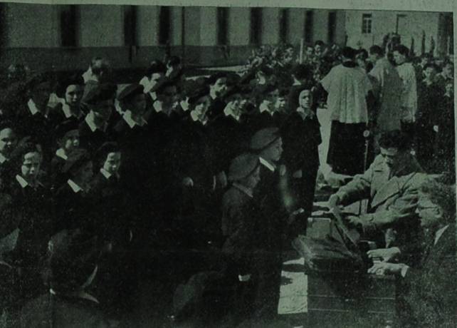 Oggi ' sono ragazzi, domani saranno uomini, saranno i continuatori coscienti della nostra i storia e delle nostre tradizioni. Qui li vediamo mentre cantano, durante la messa al campo. sotto la guido del maestro Milossi. La sera precedente il coro del collegio s'era esibito in un'applaudita esecuzione di canti vecchi e nuovi della nostra terra - foto