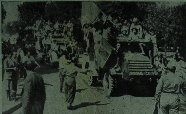16.9.1947. Entrano finalmente le tanto attesa truppe italiane. — La folla in un delirio di incontenibile passione abbraccia e bacia i soldati salendo fin sopra la torretta dei carri armati.