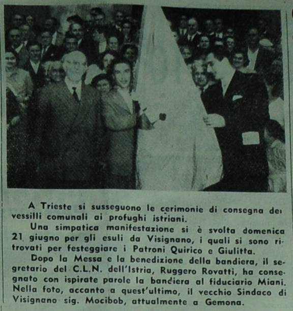 Dopo la Messa e la benedizione dello bandiera, il se¬gretario del C.L.N. dell'Istria, Ruggero Rovatti, ha consegnato con ispirate parole la bandiera al fiduciario Mioni. Nella foto, accanto a quest'ultimo, il vecchio Sindaco di i Visignano sig. Mocibob, attualmente o Gemona.