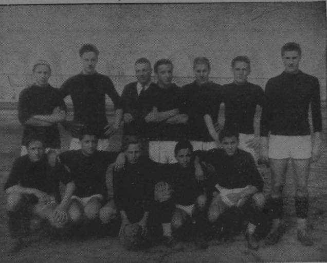 Didascalia: La squadra di calcio del Collegio Tommaseo di Brindisi; da sin. a destra: in alto Fino (ris.), Superina, il dirigente sportivo Pagliari, De Cleva, Matiassi, Uxa, Monti; in ginocchio: Rimbaldo, Fiorentini, Angelucci, Bulfoni e Saggini.